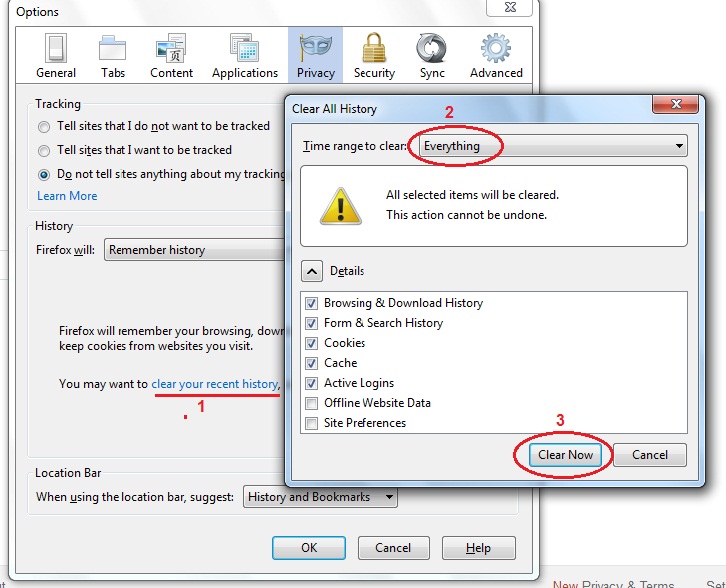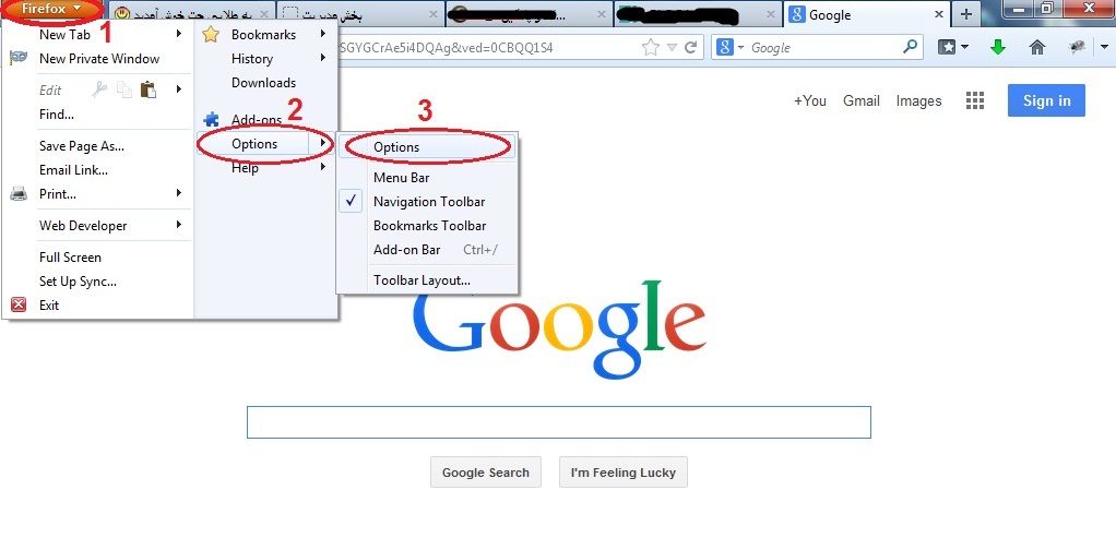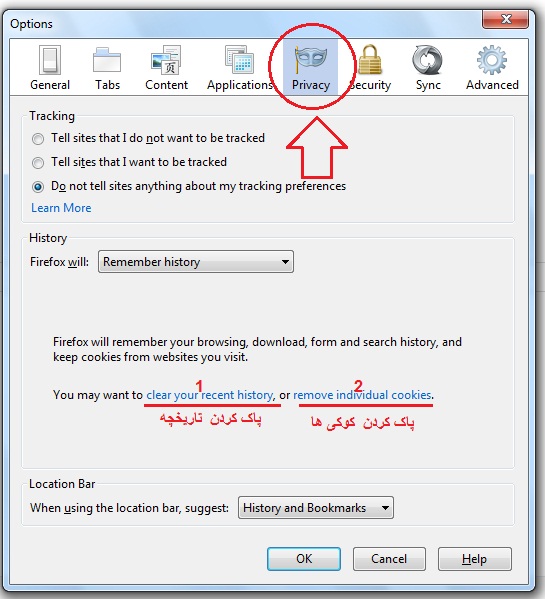 برای پاک کردن کوکی و تاریخچه ی مروگر موزیلا در ورژن های 20 به بالا از طریق عکس های زیر عمل کنید.